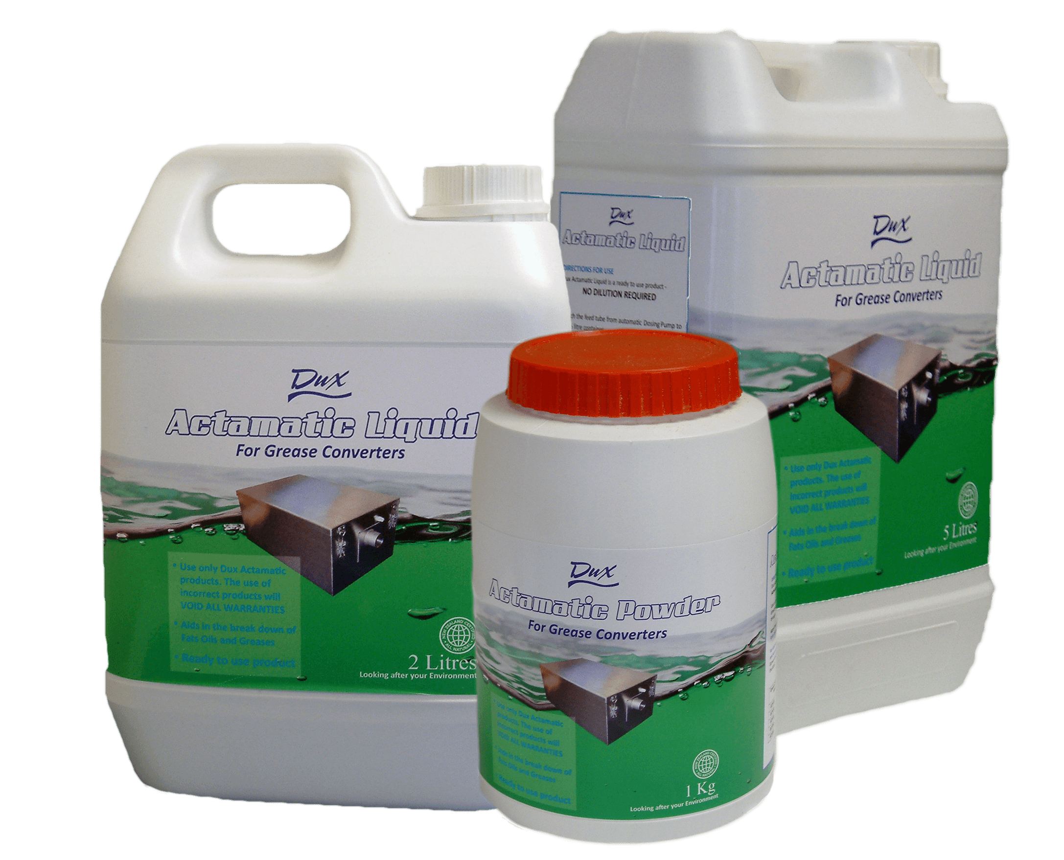 As the authorised service provider of Dux Actamatic® Grease Converters, we distribute the range of Dux Actamatic® dosing products to keep your Dux Grease Converter working efficiently. Dux Actamatic® liquid or powder products are the only manufacturer approved products to be used in the Dux Actamatic® Grease Converter. Their natural formulation has been designed to work in Dux Actamatic® Grease Converters, therefore the use of other products will void all warranties associated to the Dux Actamatic® Converter and Dosing Pump.